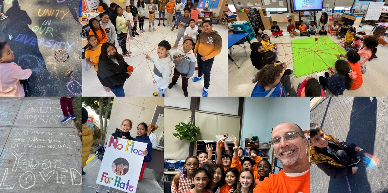 Valley Stream 24 students created unity chains and kindness webs out of orange construction paper and orange strings to symbolize togetherness and show that they are linked together. Students also took the opportunity to enjoy the fresh air and cover the school's floors with colorful and positive words and affirmations.