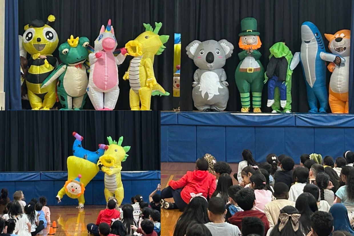 The week-long celebration culminated in a high-energy assembly featuring the much-anticipated reveal. Staff members took the stage in their costumes, which included a bumblebee, frog, shark, and unicorn, as final clues were shared about each reader. Cheers and laughter filled the room as students eagerly guessed and then discovered the identities behind the masks.